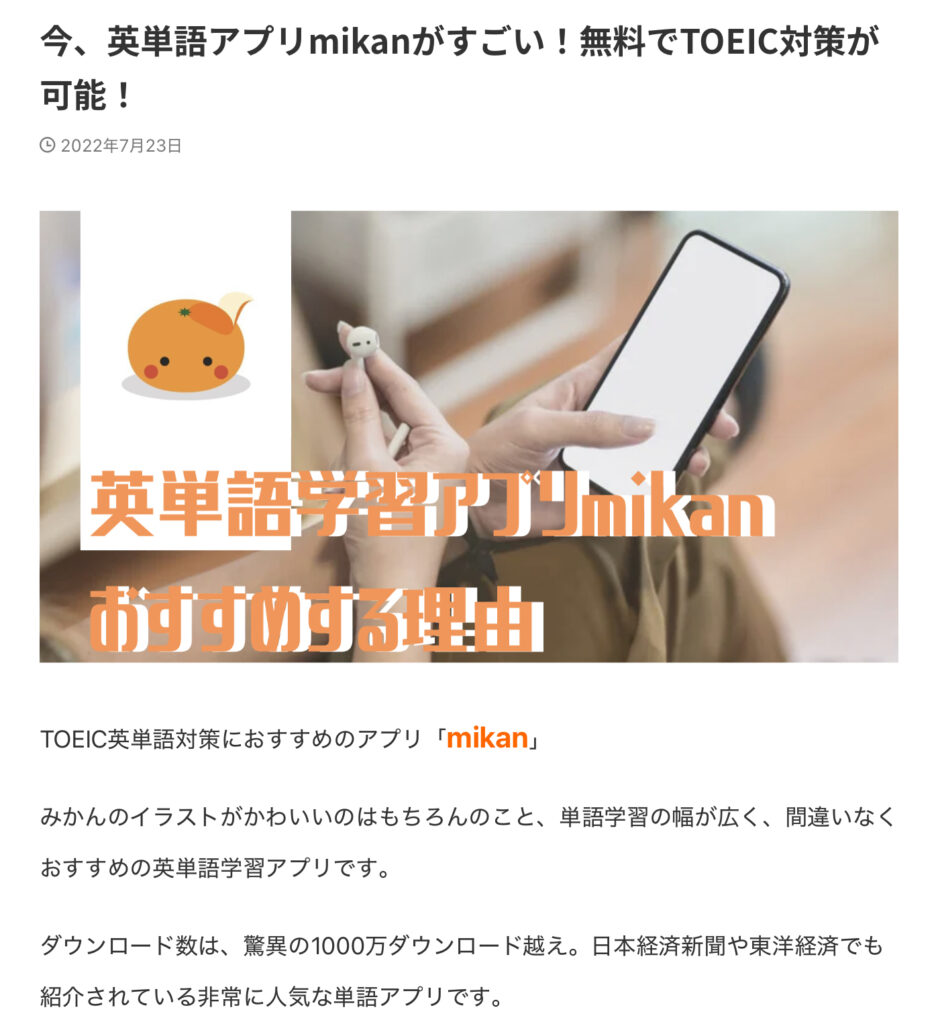 いいアプリだなと思い、過去にmikanについても動画や記事にまとめていたことがあったので、参考までに載せておきます。当初は、確か「mikan TOEIC」といったキーワードで上位表示していたと思います。